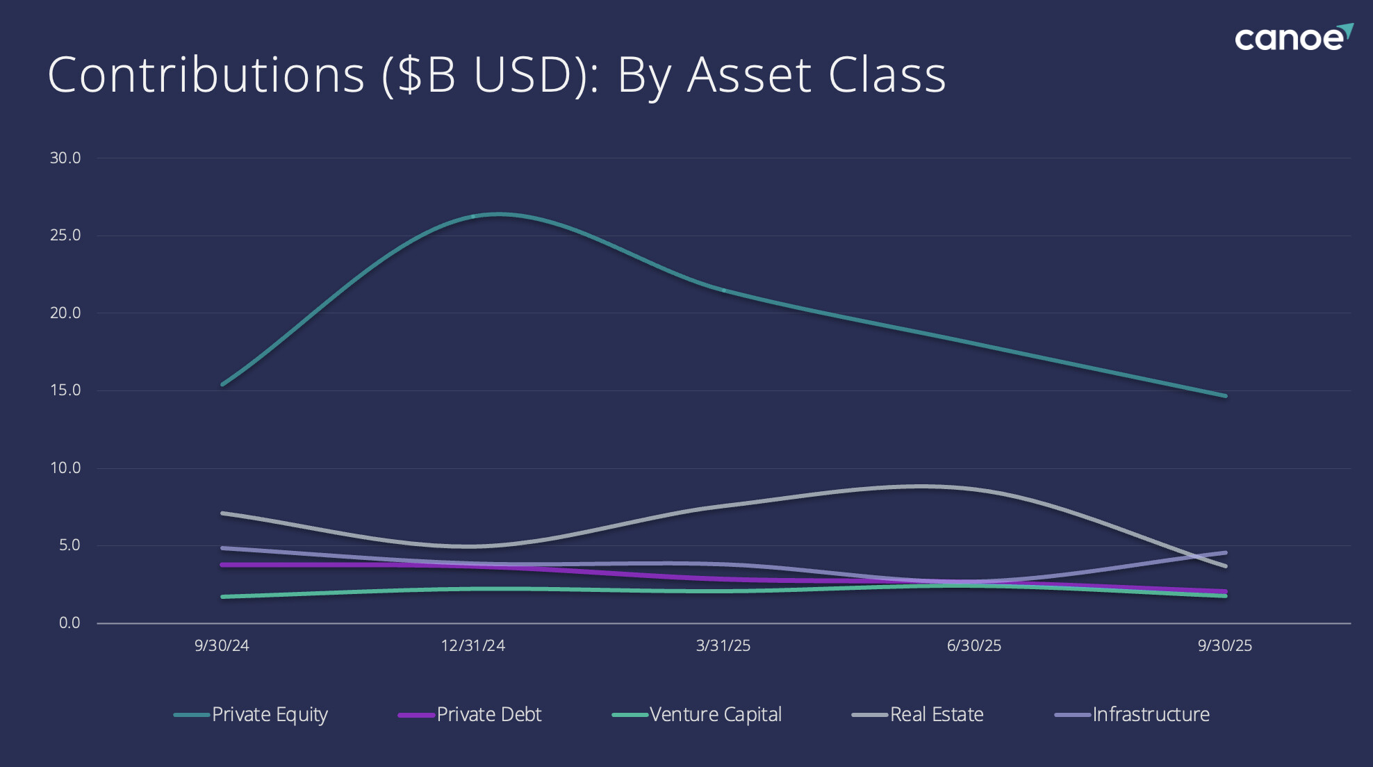 Private Debt shows a different pattern: contributions are down both year-over-year and quarter-over-quarter, indicating a more sustained pullback in deployment.